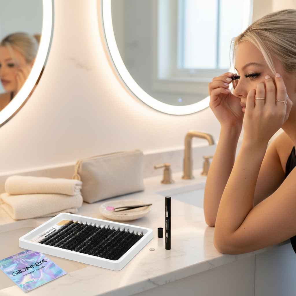 Nous recommandons une colle spéciale cluster lashes ou une colle pour extensions en bandes. Elle n'est pas incluse dans le kit mais est facilement disponible.